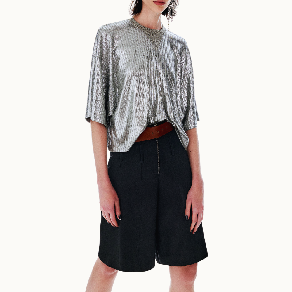 bermuda em crepe com acabamento pespontado, tem cintura baixa com passantes para cinto em duas alturas, permitindo o uso do cinto de maneira versátil. a peça tem zíper de metal aparente e acompanha cinto de couro marrom sem fivela.