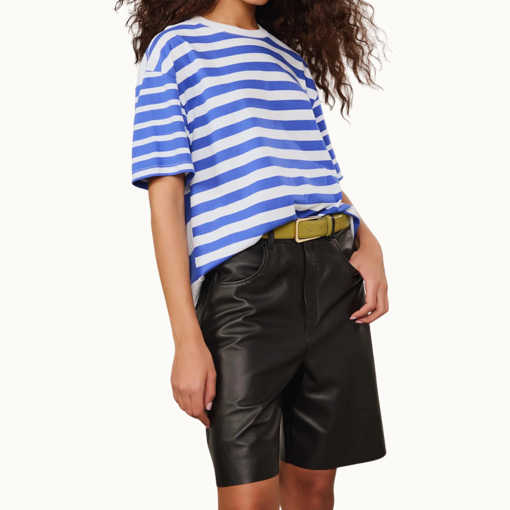 Bermuda de Couro com shape clássico, bolsos, passadores e abotoamento na cintura. Um design autêntico na matéria-prima ícone do nosso DNA.
