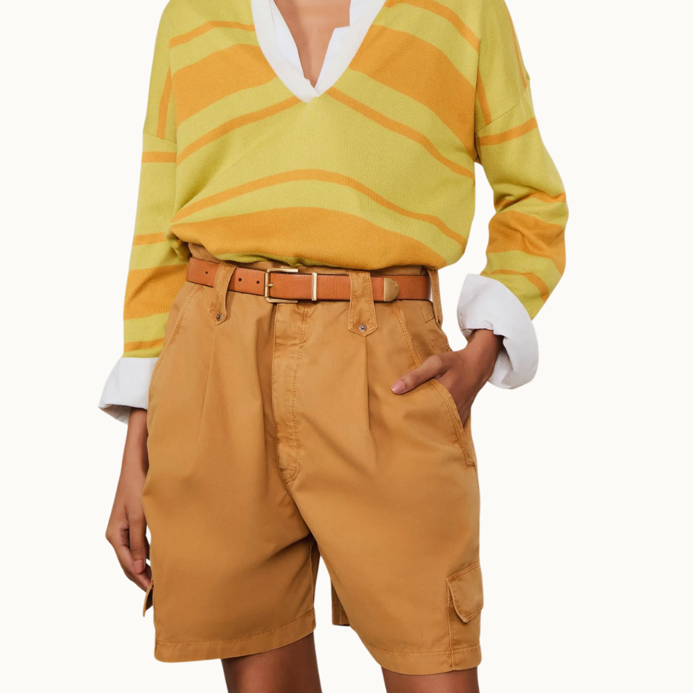 Bermuda de Sarja com shape oversized, bolsos utilitários, cintura baixa, passantes e botão metálico no cós. A matéria-prima moderna ganha destaque nas produções da estação.