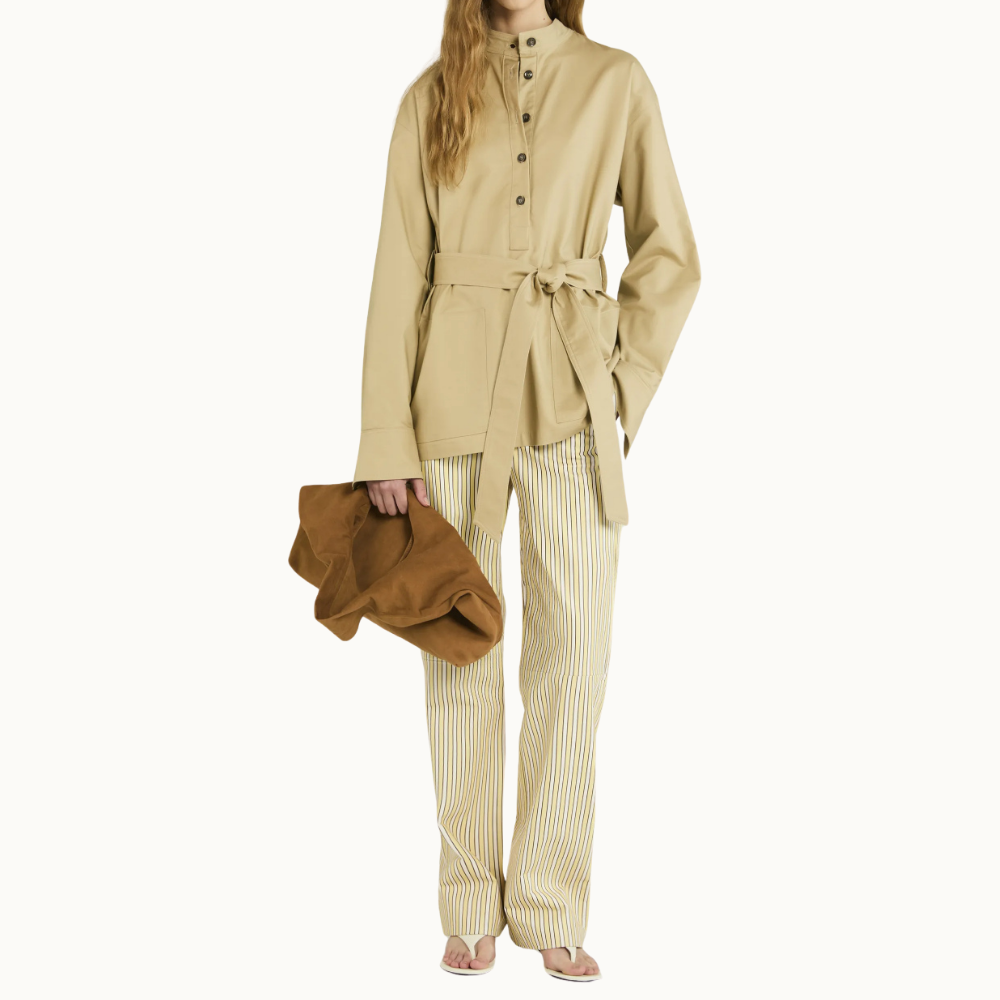 Blusa de Algodão com Manga Comprida, Vista Frente com Botões Personalizados Ab, Faixa Na Cintura e Punho com Botões Personalizados.