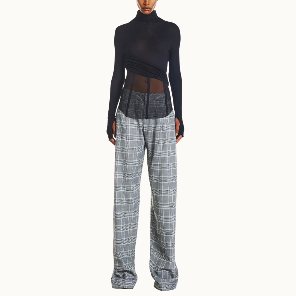 Blusa em composê de tecidos malha e tule. Modelagem ajustada ao corpo. Possui manga comprida e gola alta, detalhe de corset de tule com barbatanas para melhor ajuste ao corpo. Não possui fechamento.
