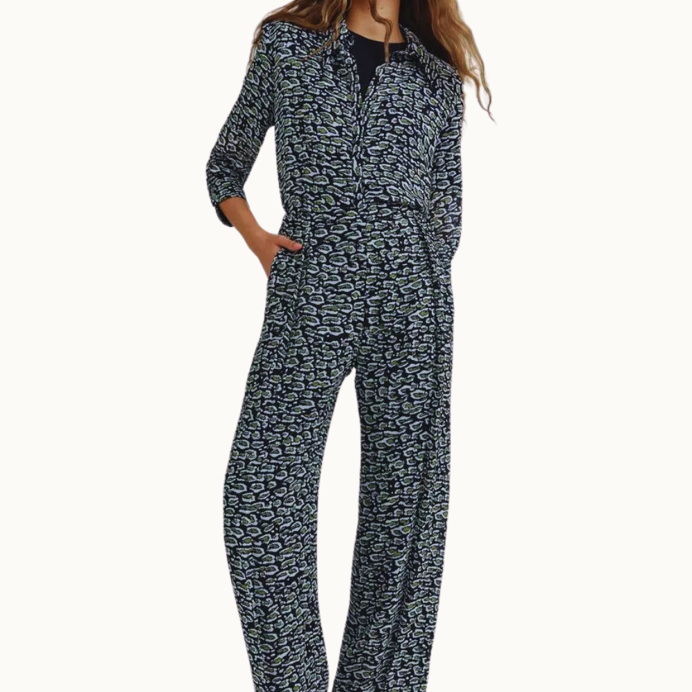 Calça longa confeccionada em viscose fluida com estampa animal print. Possui modelagem reta, cintura média e fechamento frontal com zíper, gancho e botão interno. Conta com barra reta, cós reto e bolsos funcionais, combinando conforto e estilo em uma peça versátil.