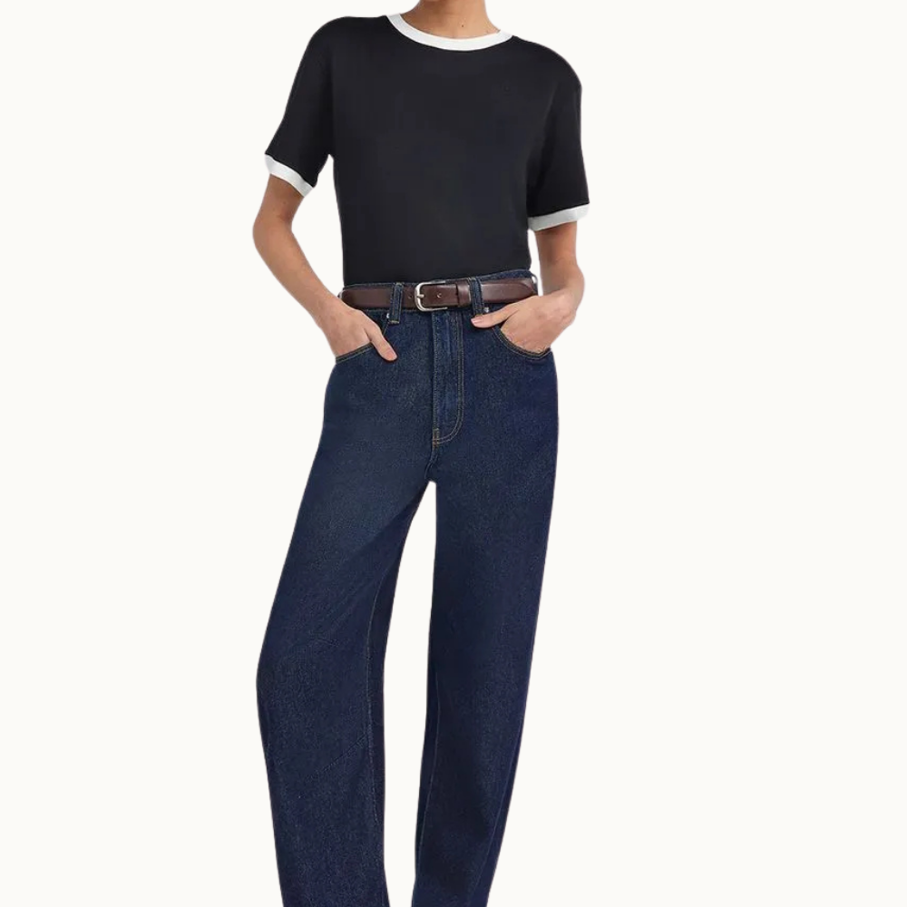Calça jeans com modelagem cenoura e cintura média. O fechamento frontal com botão e zíper de metal garante praticidade e acabamento limpo, sendo uma peça versátil para compor looks do dia a dia.