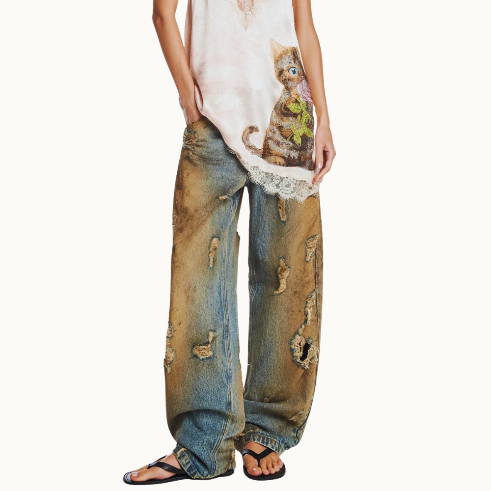 CALÇA JEANS BALLOON MANCHADA COM RASGOS
