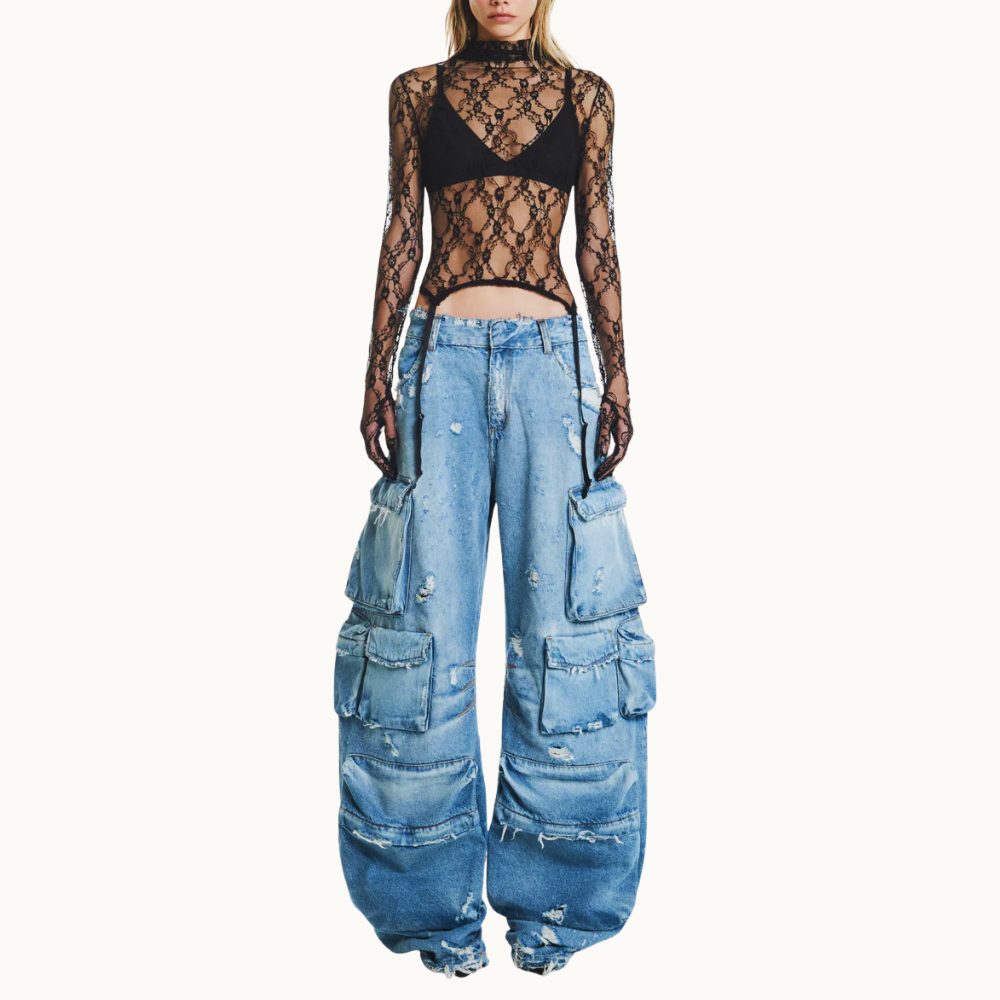 Calça jeans em modelagem cargo oversized. Possui cintura baixa, cós com passantes e bolsos laterais. Detalhes desfiados e de rasgos, e múltiplos bolsos por toda a peça, totalizando doze. Ajuste via botão de pressão na lateral das pernas no barrado. Fechamento frontal com zíper, botão e colchetes de gancho.