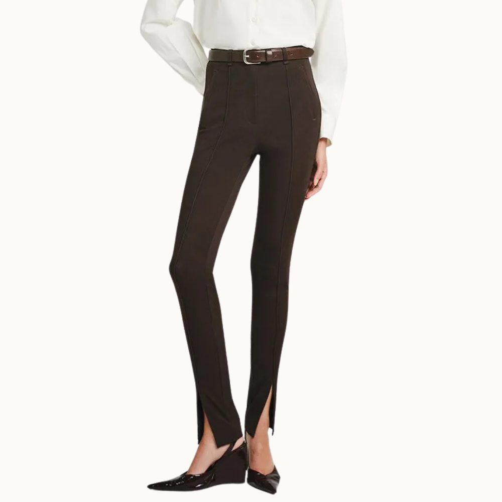 Calça em alfaiataria com modelagem skinny e cintura alta, ideal para um visual sofisticado. De comprimento longo, possui cós alfaiataria, fechamento frontal com gancho e barra invisível. Conta ainda com bolsos posteriores, bolso vivo e fenda na barra, que garante modernidade ao design clássico.