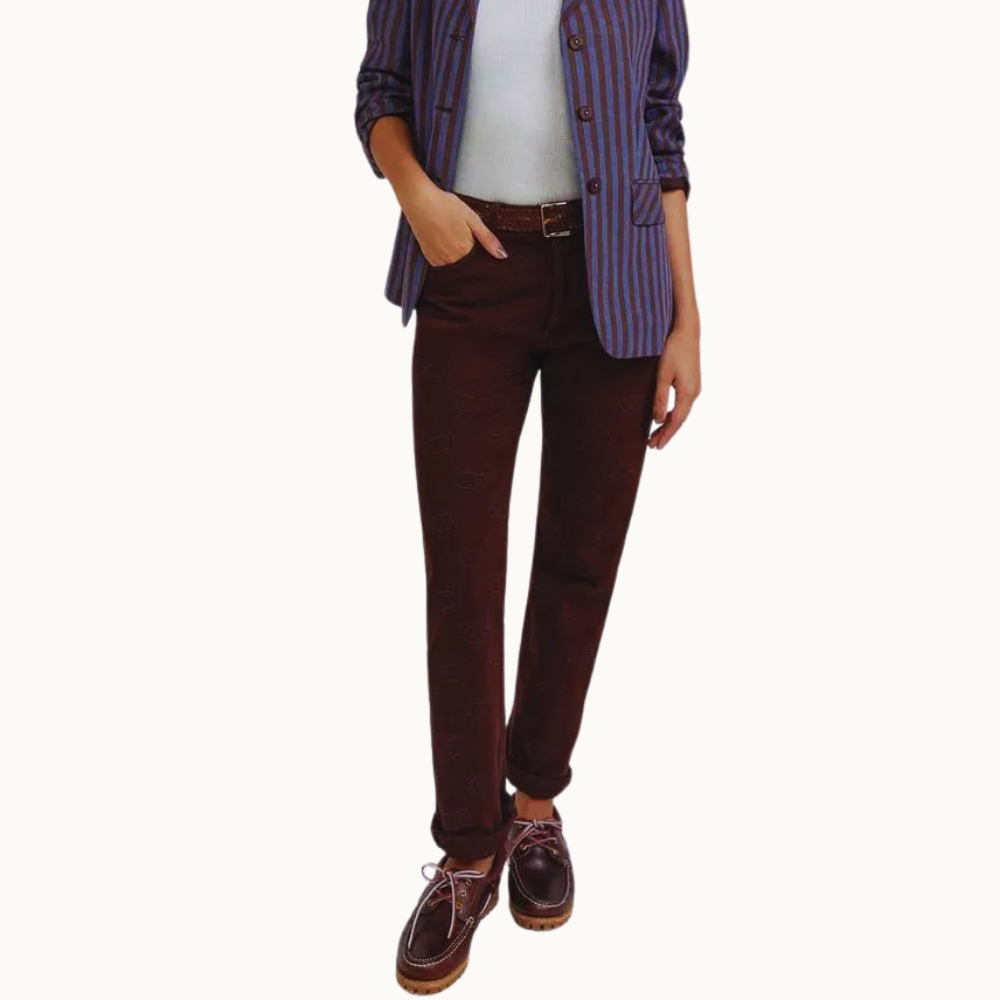 Confeccionada em sarja, a calça apresenta modelagem reta e comprimento regular. Com cintura média e cós regular, possui bolsos frontais e posteriores. O fechamento com botões e a barra reta complementam o visual, enquanto a padronagem paisley adiciona um toque de estilo ao look.