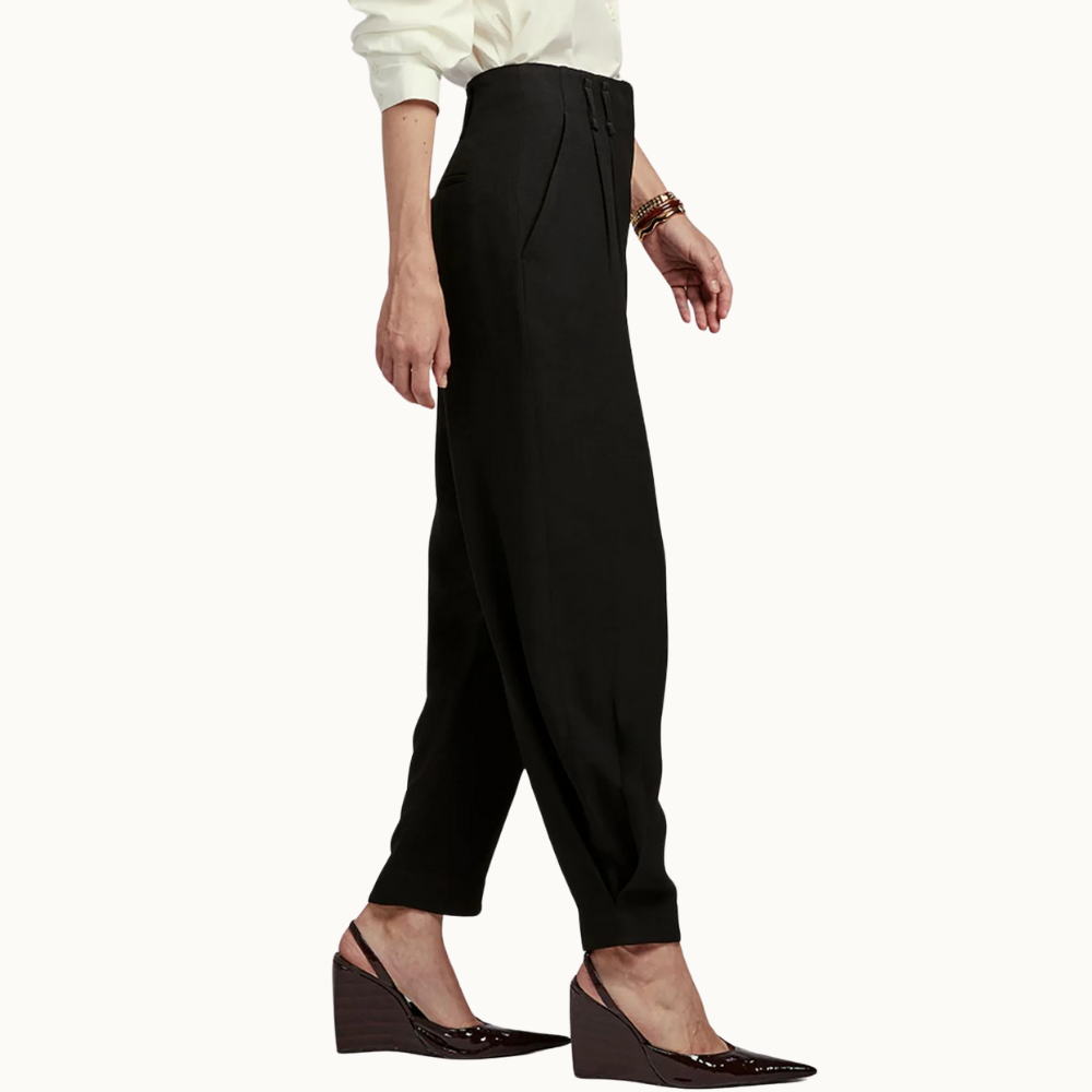 Calça cenoura confeccionada em alfaiataria com cintura alta e comprimento longo. Possui cós alfaiataria, pregas frontais, fechamento com zíper, gancho e botão interno, barra com revel e bolsos faca. Perfeita para um visual sofisticado com toque contemporâneo.