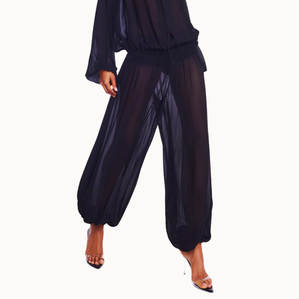 Calça em crepe leve, modelagem ampla e caimento fluido com volume. Possui cintura com aplicação de lastex dando elasticidade na cintura e quadril e elástico no acabamento da barra, remetendo ao estilo Aladim. Não possui fechamento. Acompanha combinação (Hot Pants).