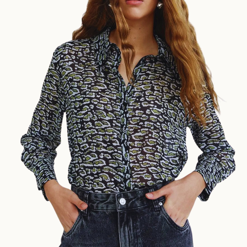 Camisa confeccionada em viscose fluida, com modelagem e comprimento regulares. Apresenta estampa que mescla arabescos e animal print, manga longa, gola tradicional e fechamento frontal com botões. A barra reta reforça o caimento elegante e moderno da peça.