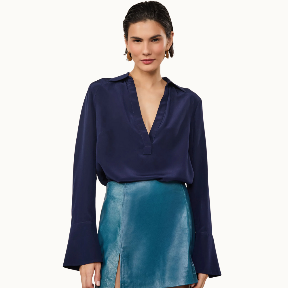 A Camisa Polo 100% Seda possui mangas longas, decote em V transpassado, gola colarinho e comprimento clássico. A peça também apresenta punhos amplos com pence e abotoamento. Novidade da nossa linha best-seller.