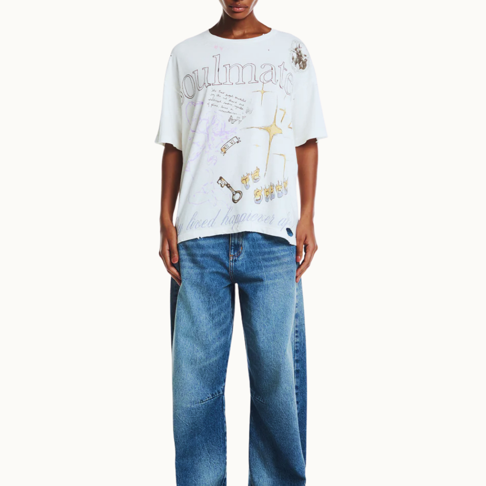 Camiseta em algodão com efeito destroyed e modelagem ampla. Possui decote redondo e manga curta. Não possui fechamento.