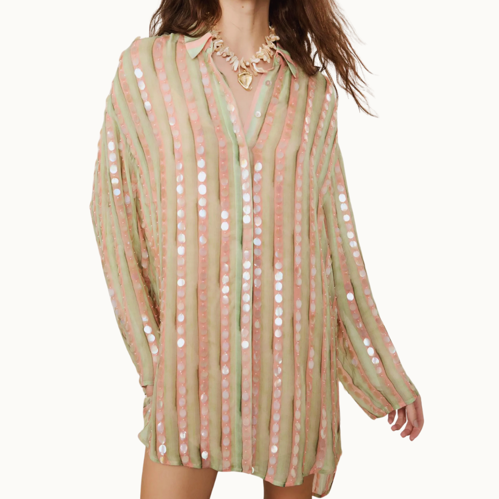 Chemise com comprimento alongado, barra fraldada e parte traseira assimétrica. A peça possui mangas longas, gola colarinho e abotoamento frontal. Como detalhe especial, apresenta paetês aplicados ao longo do modelo. Uma proposta autêntica que traduz a leveza da estação.