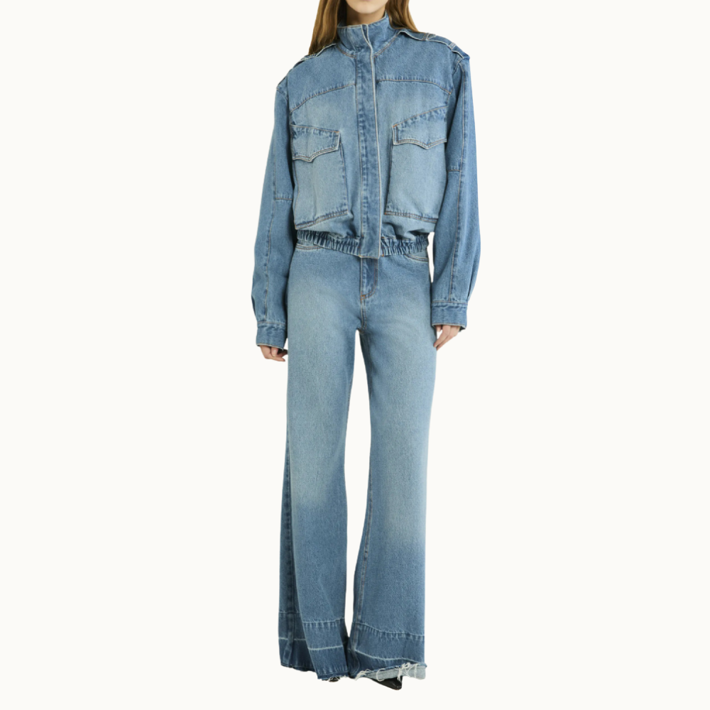 Jaqueta Jeans Oversized com Detalhes de Martigales e Bolsos Aplicados.