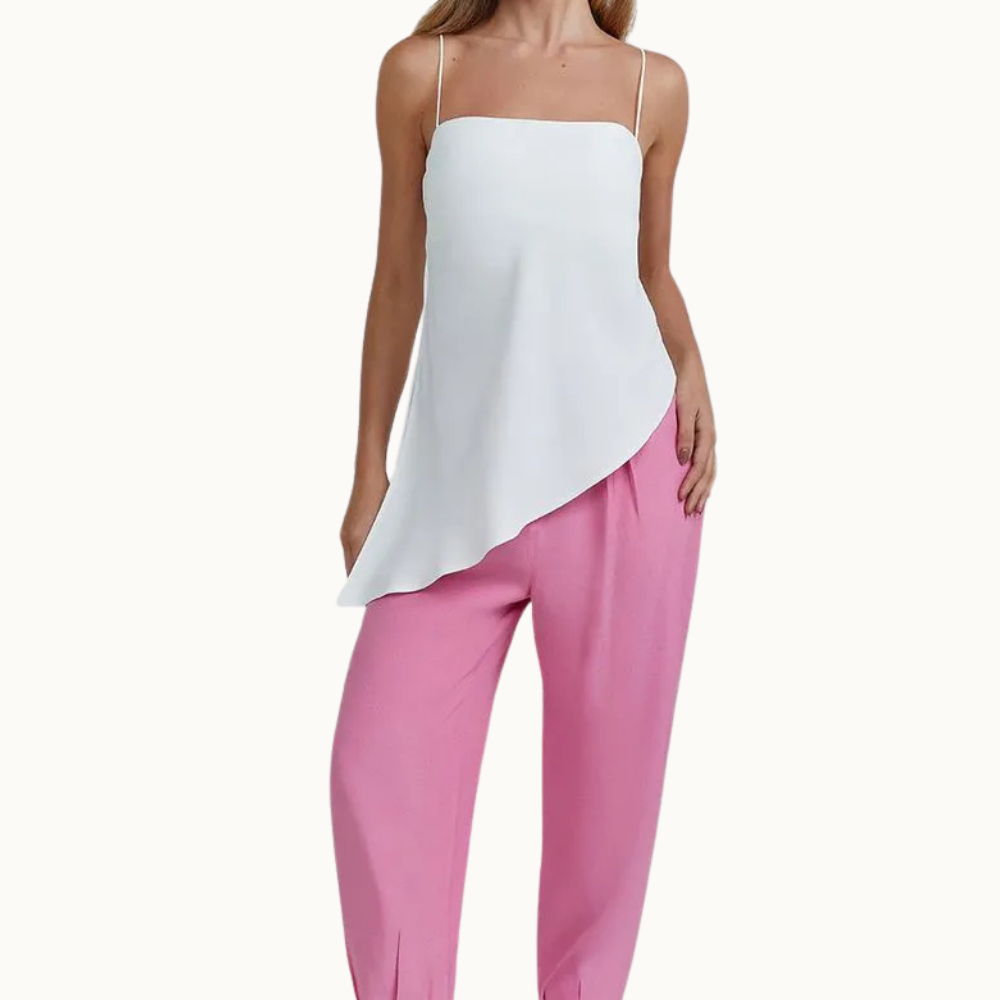 Blusa confeccionada em crepe alfaiataria, com modelagem slip e comprimento midi. A peça sem estampa possui alças finas, decote reto e fechamento lateral com zíper invisível. O destaque fica por conta da barra assimétrica com fenda, que adiciona leveza e modernidade à silhueta.