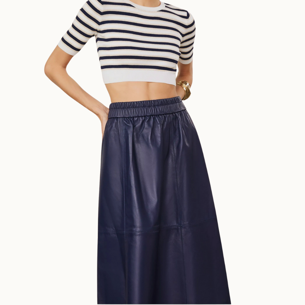 Saia Midi de Couro com elástico na cintura, shape amplo e recortes pespontados. Um must-have atemporal.