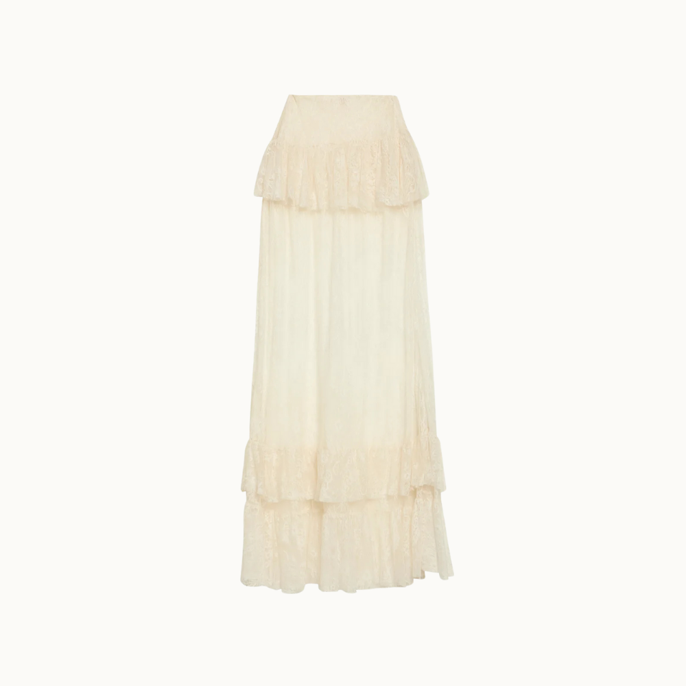 Saia longa em renda com transparência, modelagem reta e shape soltinho. Possui detalhe de pala com franzidos e sobreposição de babados no quadril e na barra. Fechamento por zíper invisível. Acompanha combinação (Saiote).
