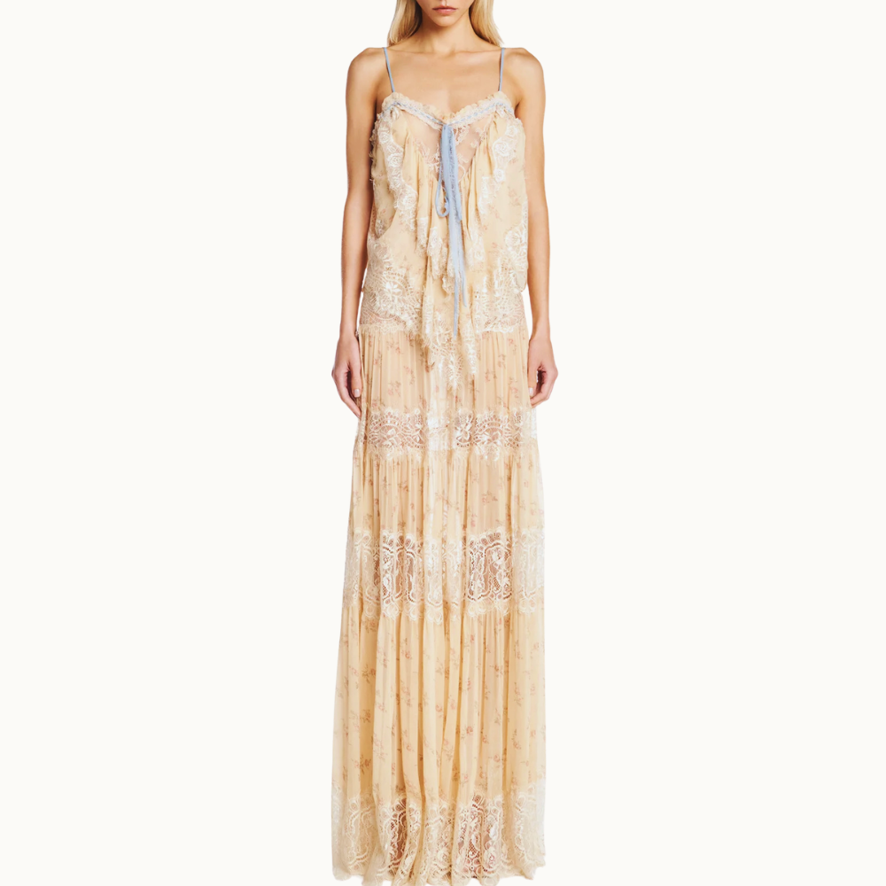 Saia longa em renda com transparência, modelagem reta e shape soltinho. Possui detalhe de pala com franzidos e detalhe de rendas por toda a peça. Fechamento por zíper invisível. Acompanha combinação (Saiote).