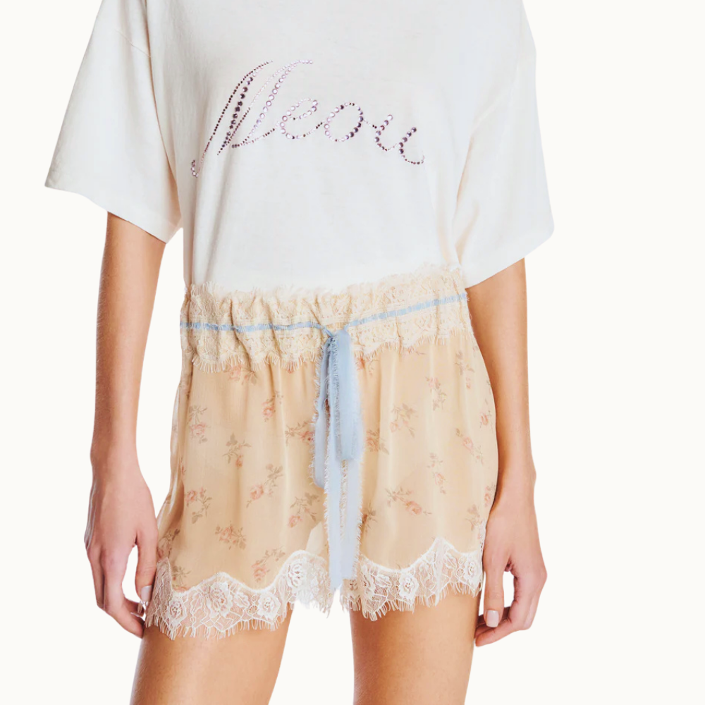 Mini shorts de cintura baixa em renda e estampa floral com transparência. Possui cós de renda com passa fita à fio. Modelagem soltinha ao corpo e elástico para melhor sustentação nas costas. Não possui fechamento.