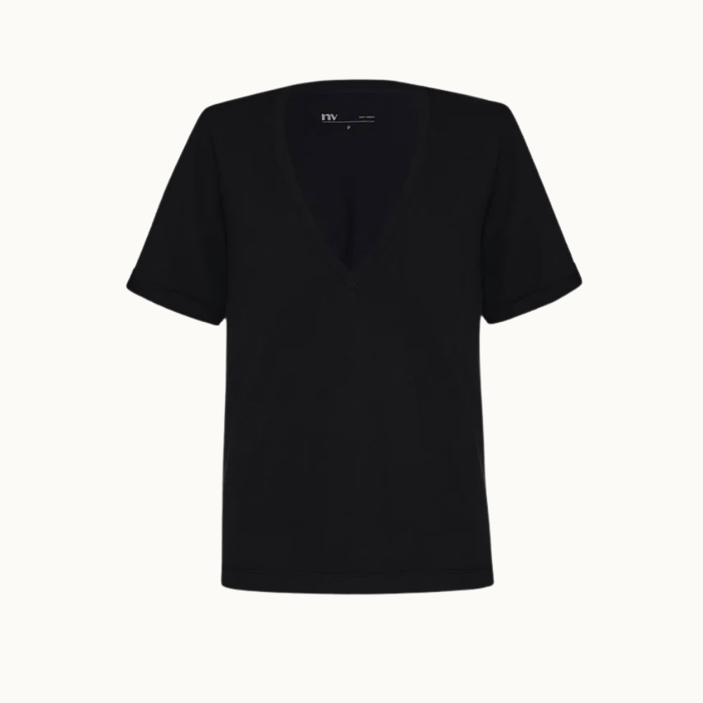 T-shirt feminina confeccionada com malha de algodão com modelagem regular e comprimento regular. Possui manga curta e decote V. Atemporal e versátil, é ideal para compor produções confortáveis com sofisticação sutil.