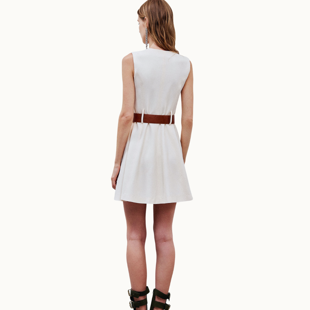 vestido em crepe com acabamento pespontado, tem shape acinturado no top e saia com movimento, zíper de metal no decote e acompanha cinto de couro marrom sem fivela.