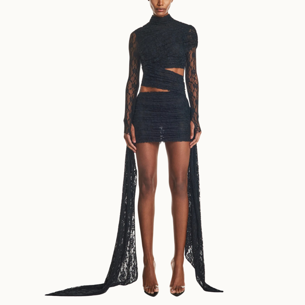 Vestido em renda com forro de tule. Modelagem ajustada ao corpo. Possui gola alta e mangas longas. Detalhe de recortes com elástico embutido para melhor ajuste e conforto ao corpo. Barrado assimétrico com ponta comprida na lateral. Fechamento por botões.