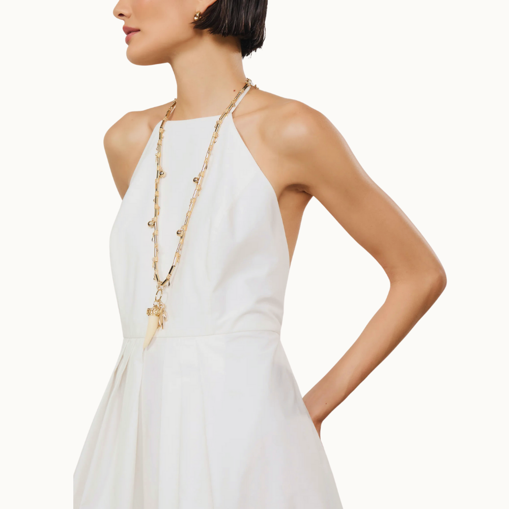 Vestido Midi Liso com decote reto frente única, alças com amarração regulável nas costas, fechamento por zíper na cintura, saia rodada com plissado frontal, fenda traseira e bordados na barra. Com proposta artesanal, traduz sofisticação e leveza.