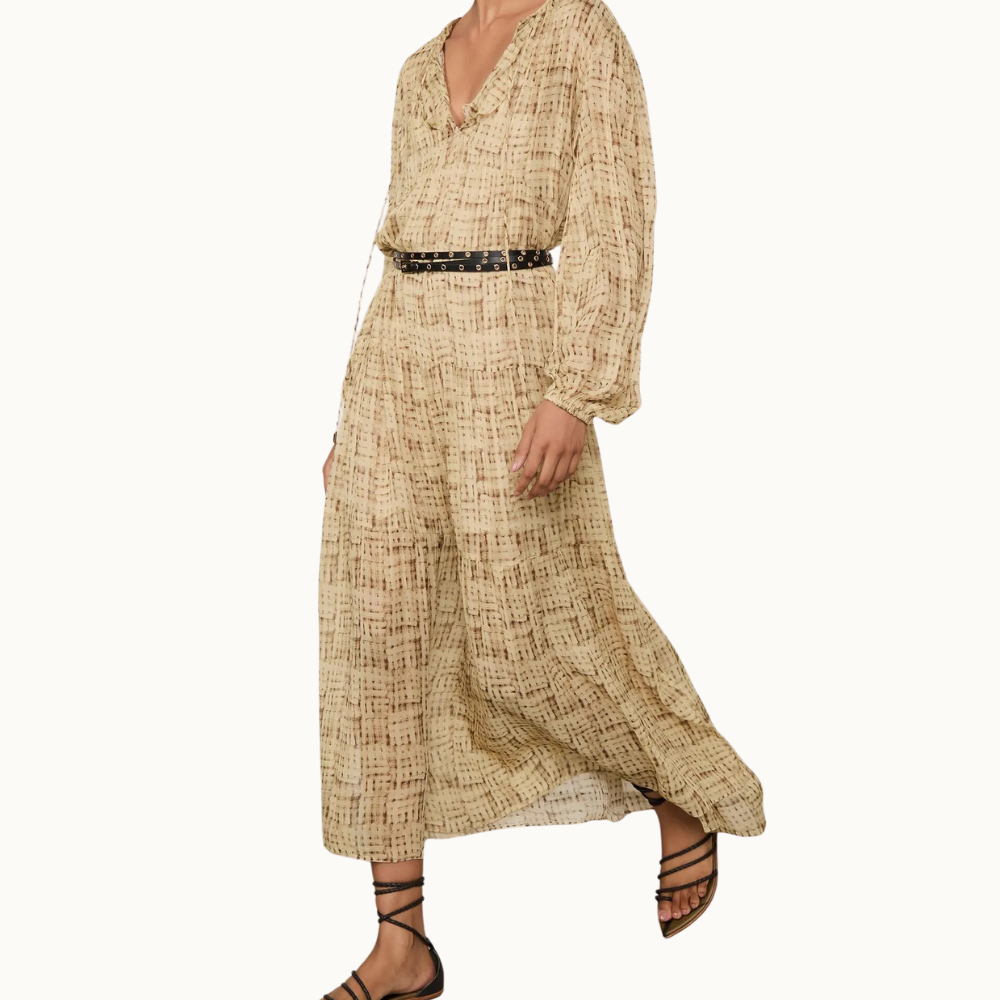 Vestido Midi Estampado com shape amplo, mangas longas com elástico nos punhos, recortes na saia evasê, decote em V com babado e tiras para amarração. Uma escolha que combina atemporalidade e leveza.