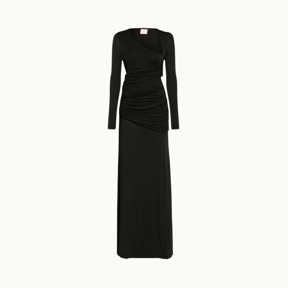 VESTIDO LONGO TRANSPASSES DECOTE ASSIMÉTRICO MANGA LONGA