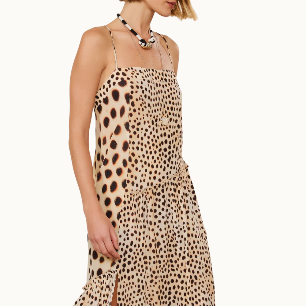 Vestido Midi Estampado com alças finas, decote reto, recortes e fenda na barra. Com animal print e design sofisticado, o modelo revela uma proposta fluida, feminina e autêntica. Uma silhueta que traduz nossa essência.