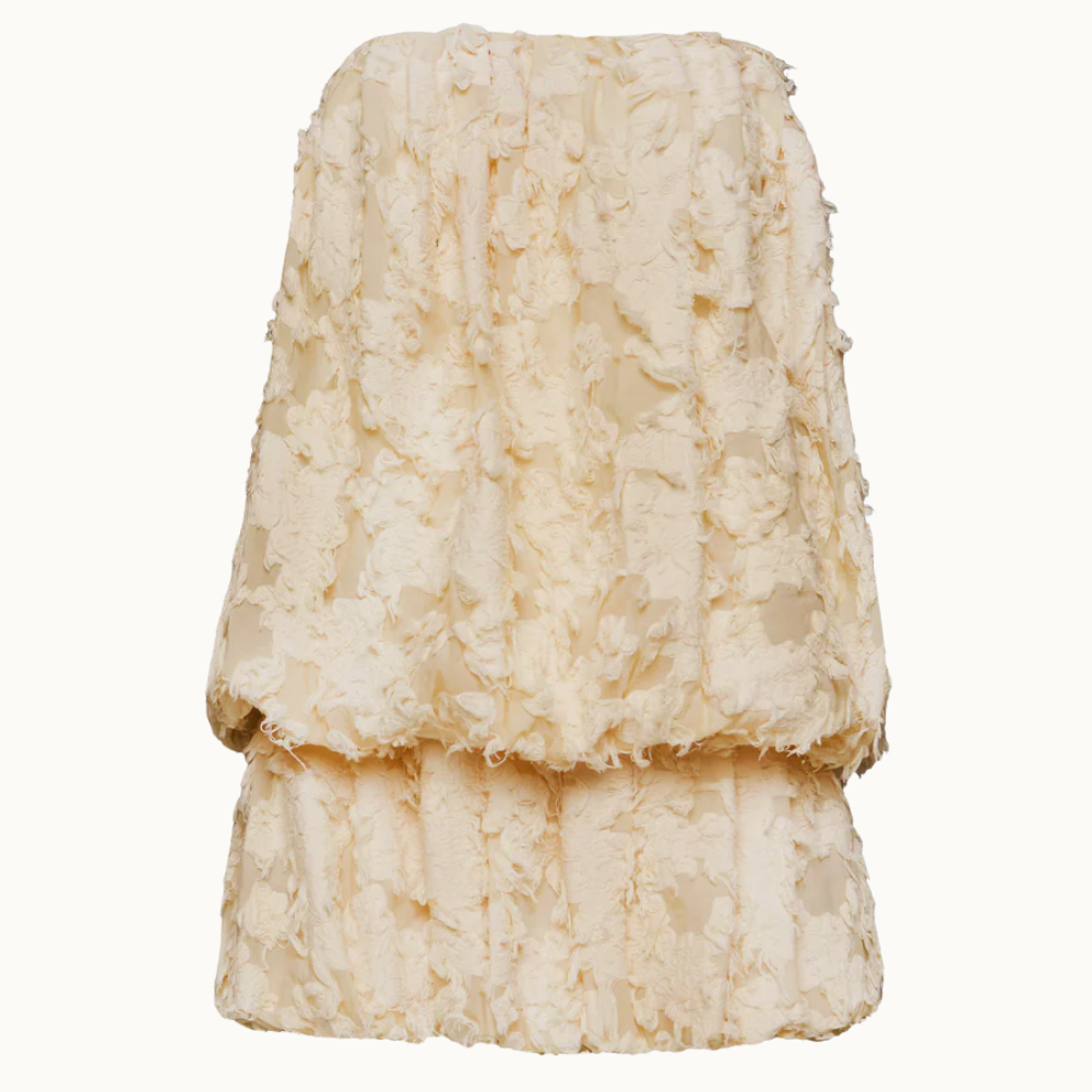 Vestido curto tomara que caia com textura em relevo. Modelagem balonê. Possui elástico embutido no decote, para maior ajuste e conforto ao corpo e detalhe drapeado com elástico no quadril. Não possui fechamento.